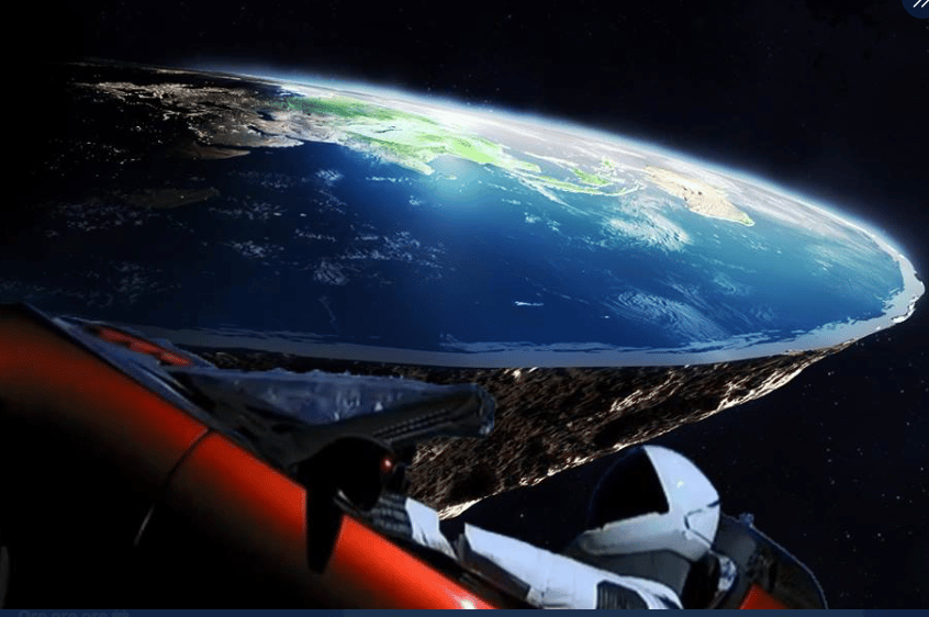 Nous pouvons donc retrouver Superman assis à côté de Starman dans la voiture mais aussi des images de la terre plate réalisées par des FlatEarth, personnes qui pensent que la Terre est plate.